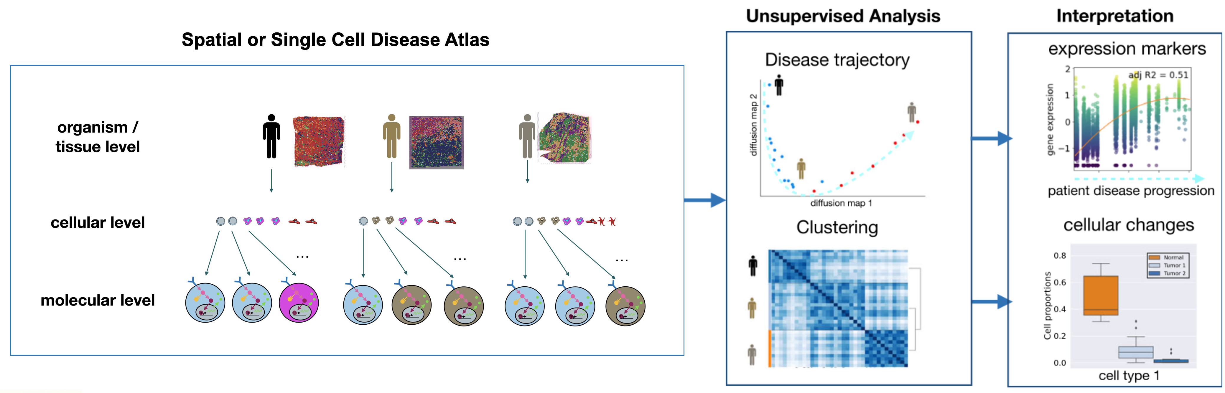 We build statistical and machine-learning tools to analyze and integrate multi-scale omics data, from single-cell transcriptomics and epigenomics to spatial tissue maps and clinical phenotypes. A central focus is our PILOT framework, which uses optimal transport theory to model continuous disease progression across individuals. This approach allows us to reconstruct disease trajectories, identify pivotal molecular events, and map how tissue composition evolves over time (https://diseasecellatlas.org/). This has been used to uncover molecular mechanism driving fibrosis in kidney and heart diseases.