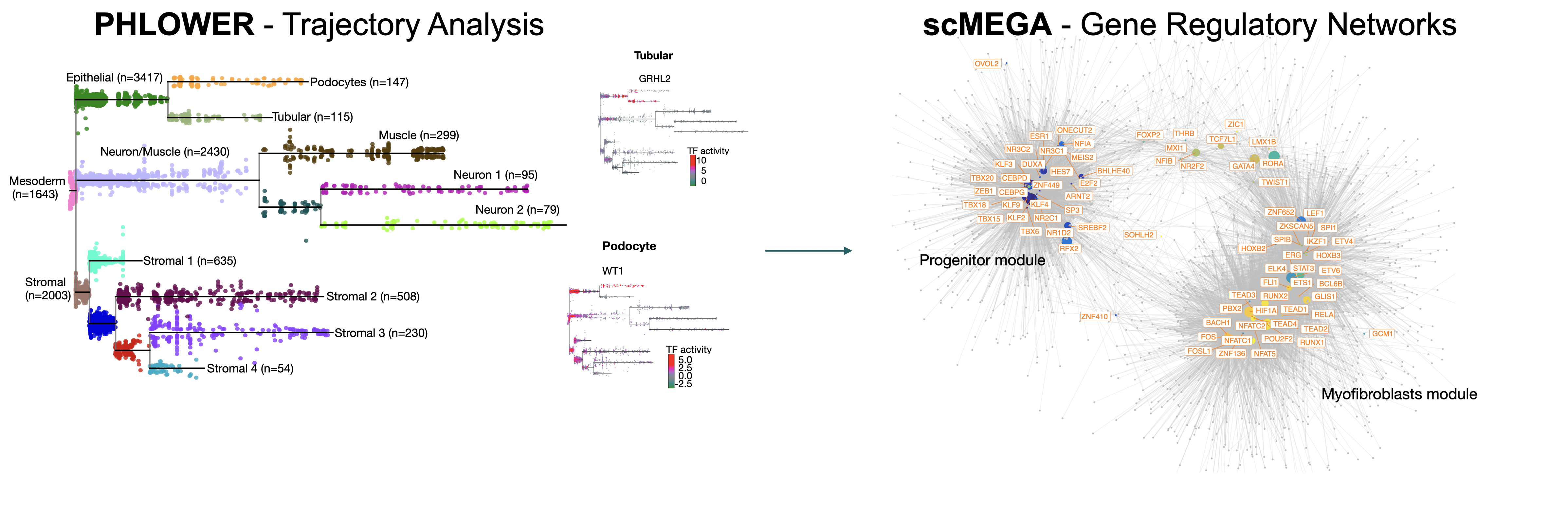 We develop computational methods that explain how cells acquire distinct identities through coordinated changes in gene expression, chromatin accessibility, and transcription factor activity. Our algorithms include PHLOWER, a topology-aware trajectory inference method that reconstructs continuous cell-state transitions, and scMEGA, a framework that integrates single-cell transcriptomic and epigenomic measurements to infer enhancer-driven regulatory networks. We also created HINT, a digital footprinting suite that identifies transcription factor binding sites and regulatory activity from chromatin accessibility data (ATAC-seq). These tools enable mechanistic studies of differentiation and cell-state transitions across multiple biological contexts. For example, we investigate how kidney organoids can be guided toward more mature states, how regulatory programs driving fibroblasts in post-infarction cardiac repair, and how HNF6 variants affects pancreas cell differentiation causing juvenile diabetes.