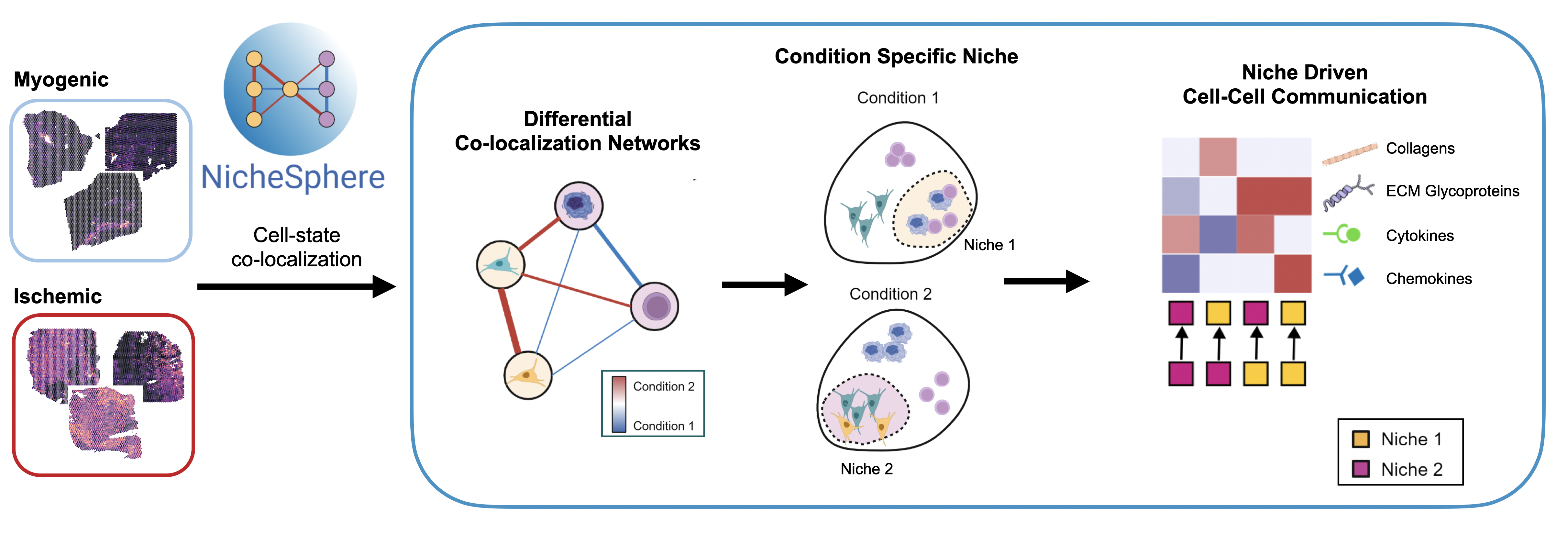 Understanding how cells behave within their tissue environment is essential for deciphering complex diseases. We develop computational methods that combine single cell and spatial transcriptomics with models of intercellular communication. CrossTalkeR allows us to identify and contrast ligand–receptor interactions across conditions such as healthy and diseased tissues, highlighting how communication networks are rewired in pathology. NicheSphere expands these capabilities by modeling co-localization data from spatial transcriptomics data as graphs, allowing us to define and analyze tissue niches — localized communities of interacting cells whose coordinated behavior drives biological and pathological processes.